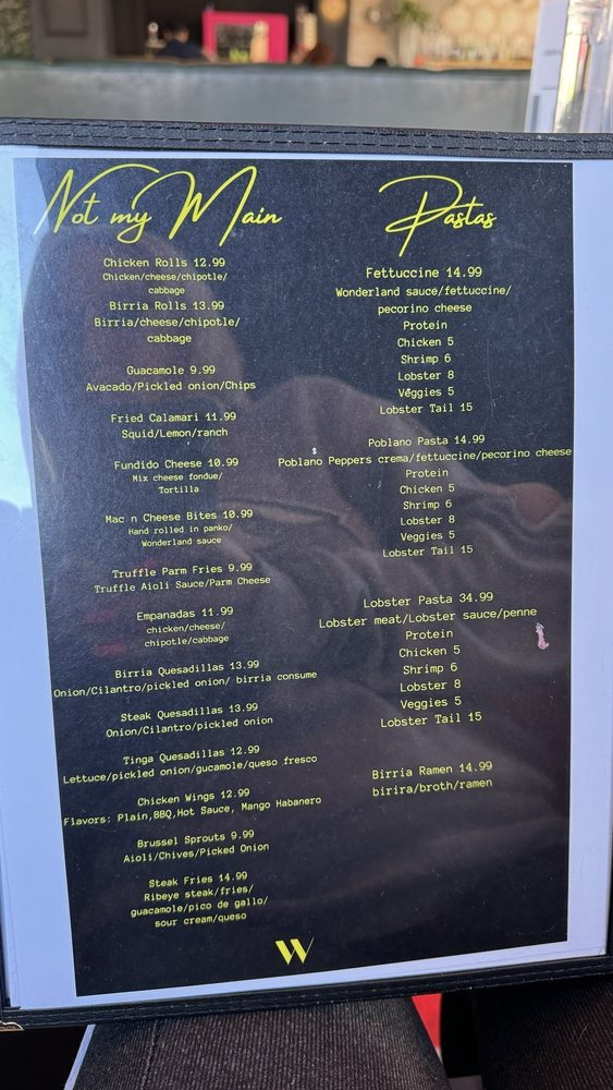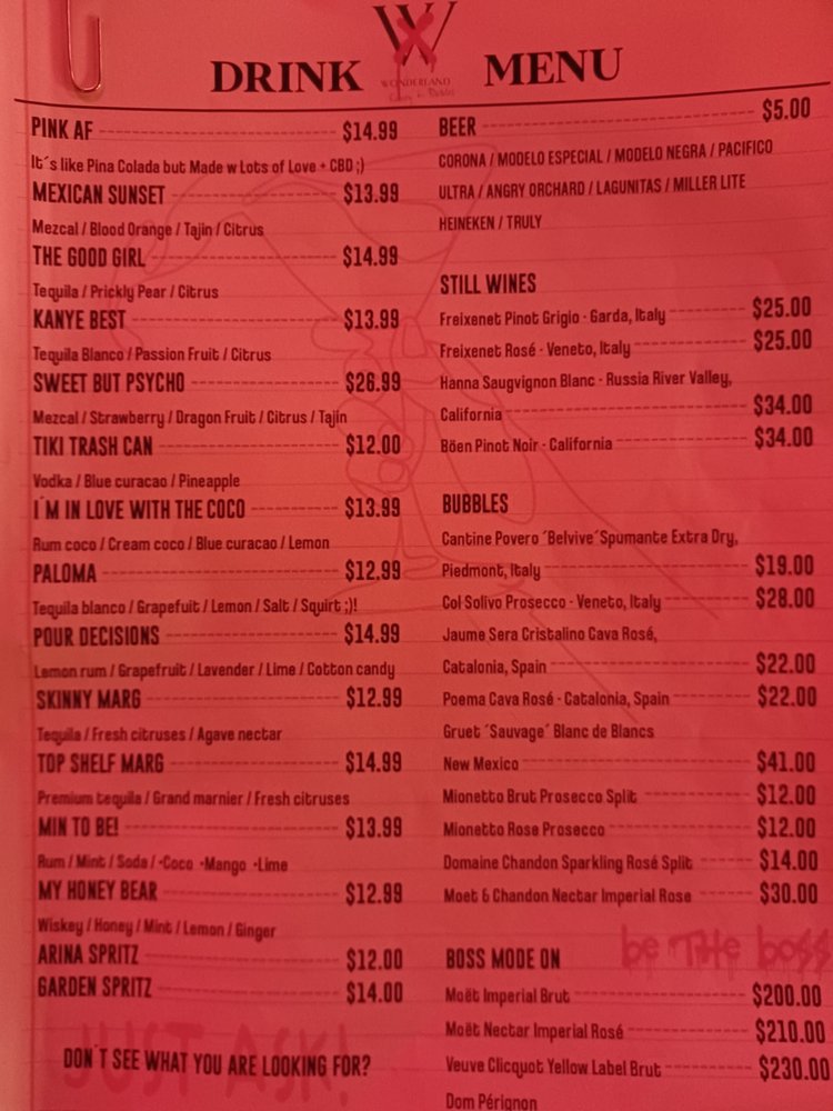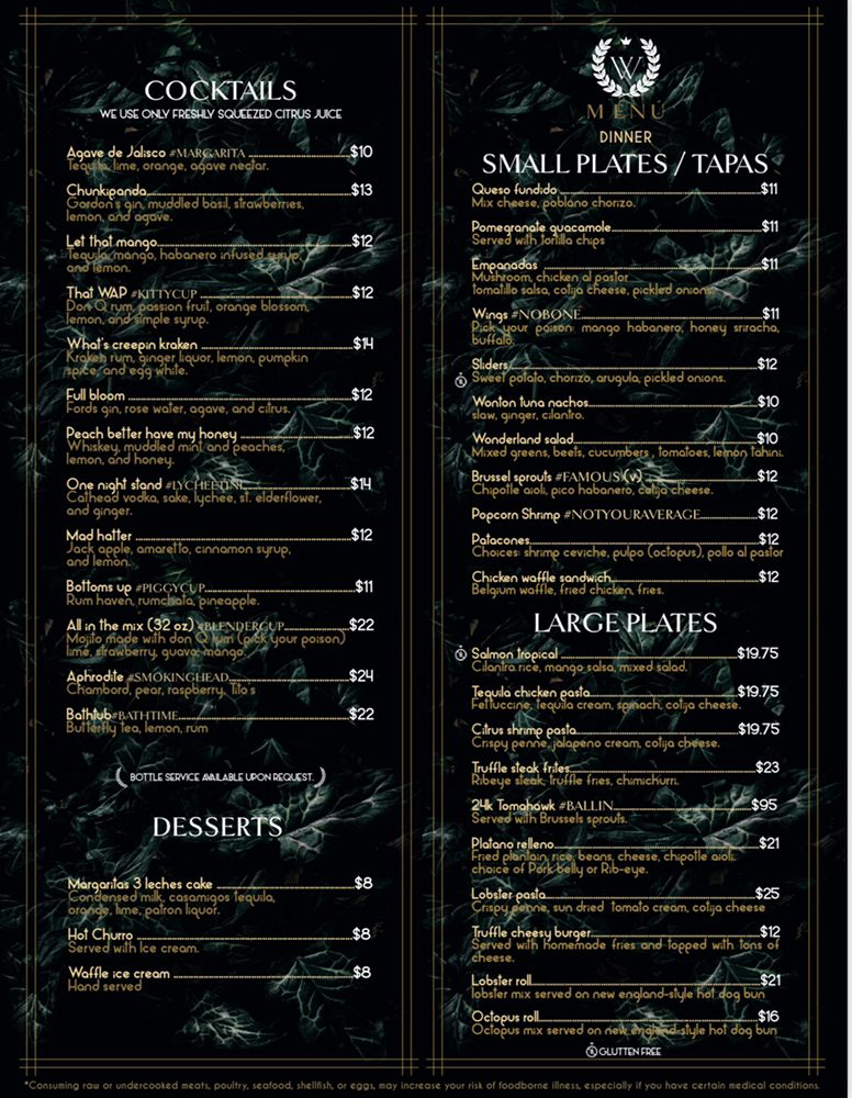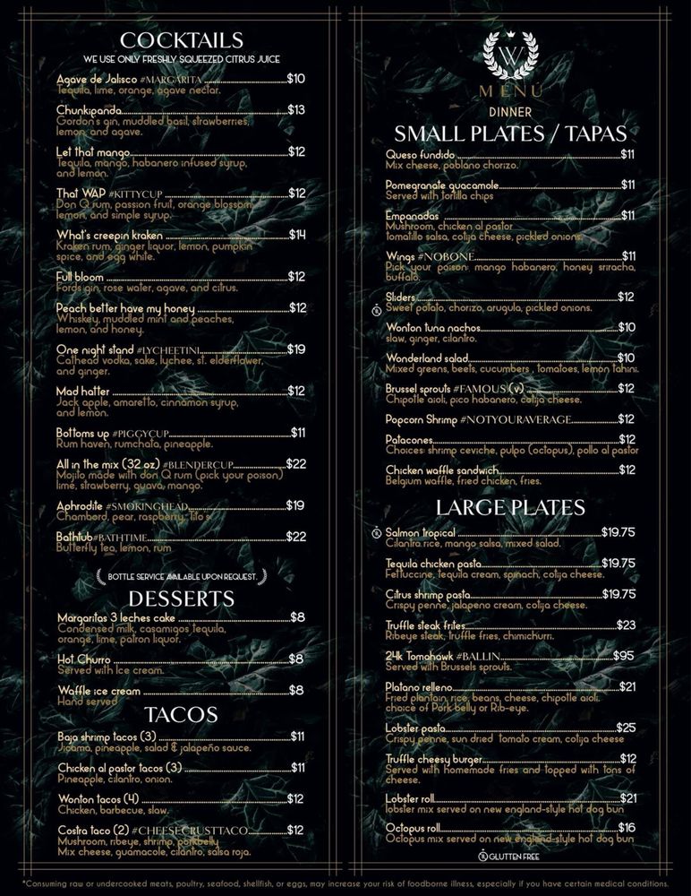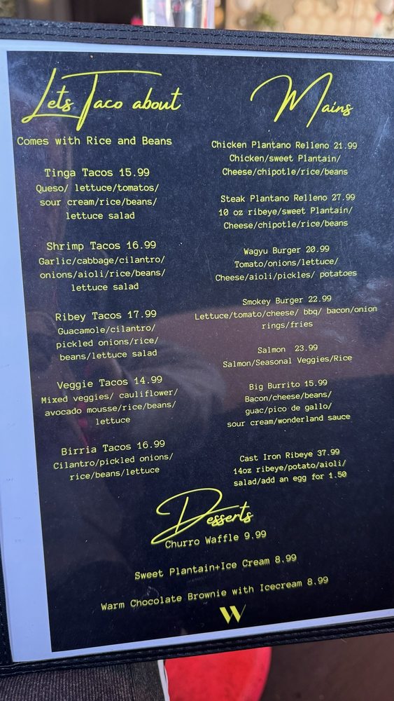 Welcome to Wonderland Tapas & Cocktails, a trendy and hipster restaurant located in Raleigh, NC. This unique spot offers a variety of small plates, large plates, and tacos for you to enjoy. Some highlights from their menu include the Queso Fundido Small Plate, Pomegranate Guacamole Small Plate, and Chicken Waffle Sandwich Small Plate. For those looking for larger portions, you can try the Bone In Pork Chop Carnitas or Tequila Chicken Pasta. The diverse selection of dishes caters to a range of tastes and preferences. With excellent customer reviews praising the food quality and service, Wonderland Tapas & Cocktails is a great choice for a night out with friends or family. Don't miss out on the vibrant atmosphere, delicious cocktails, and flavorful bites at this charming establishment.